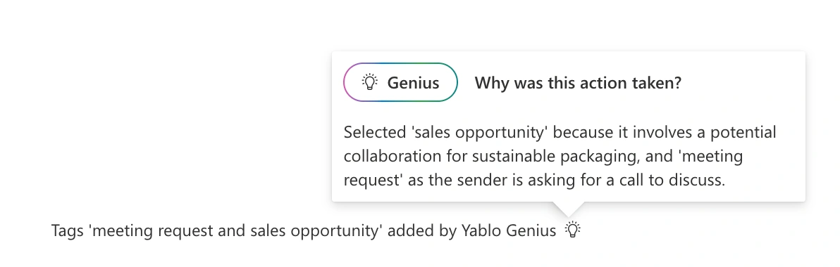 Wondering why Yablo Genius applied a certain tag or assigned a conversation to someone on your team? With full transparency built in, you’ll always see the reasoning behind every decision.