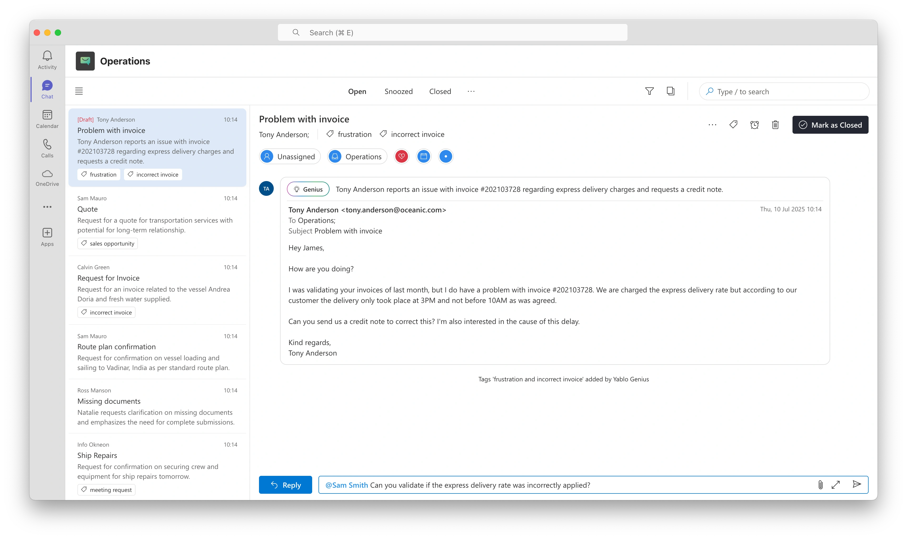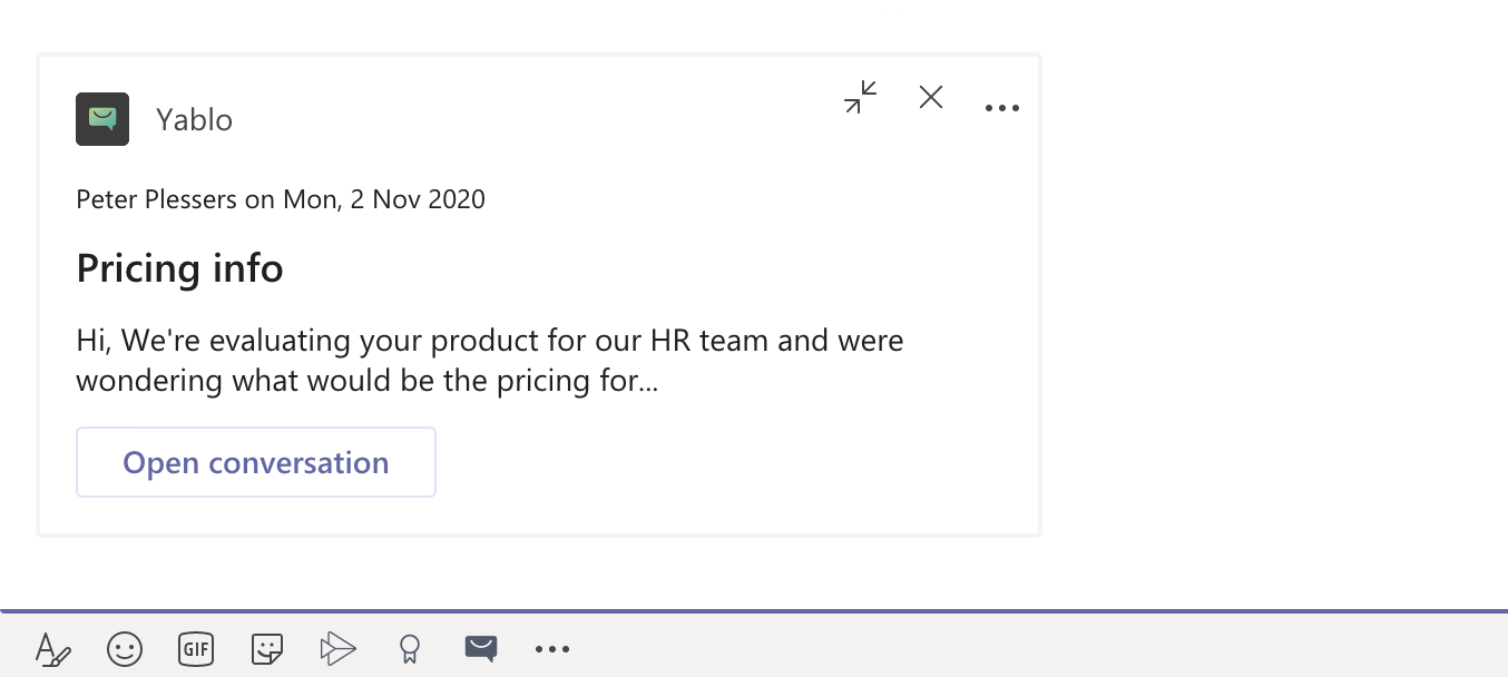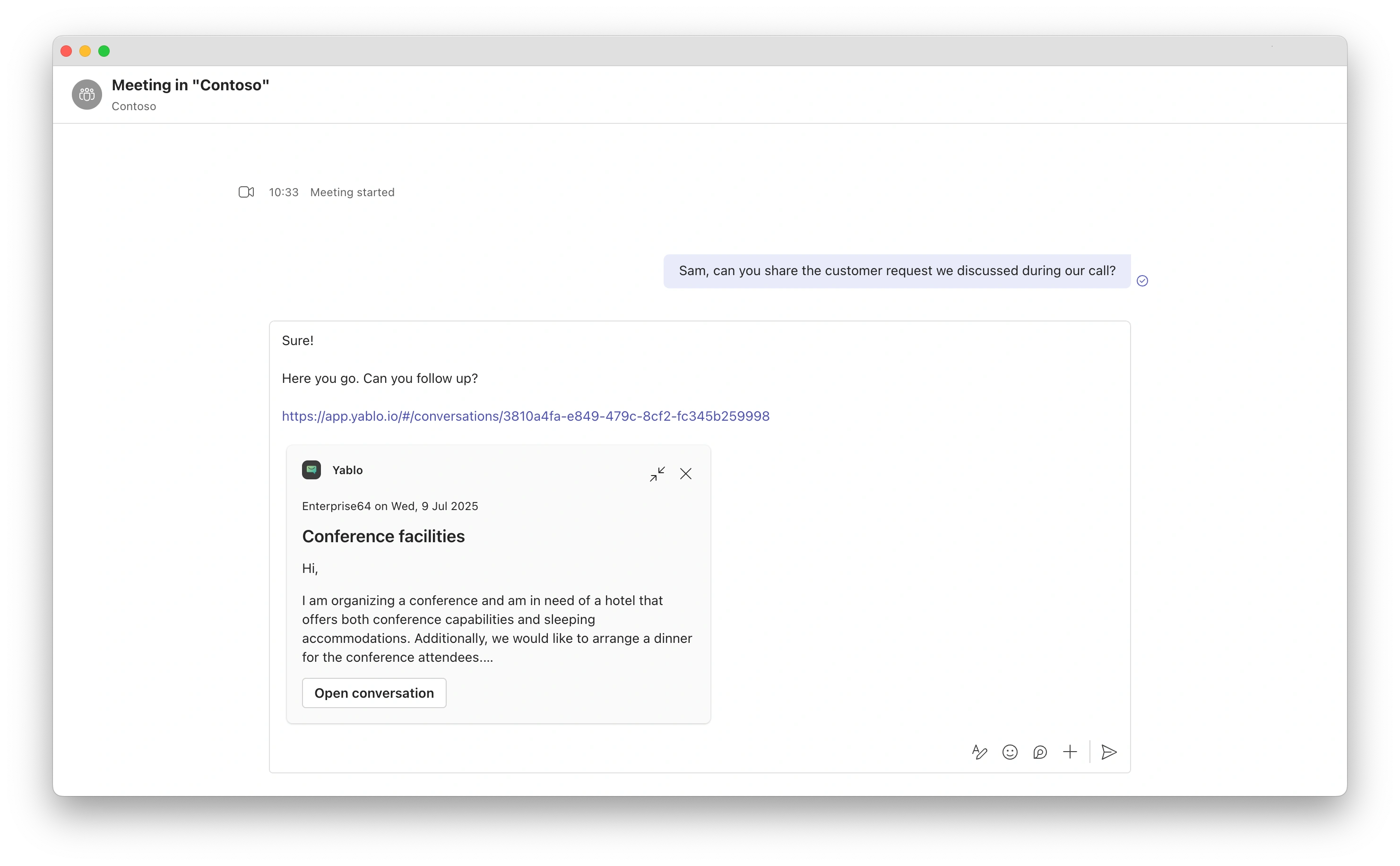 Need to get your team’s input on a customer request? With Yablo, you can share any conversation directly in Microsoft Teams — during a chat or meeting — and collaborate without switching tools or losing context.