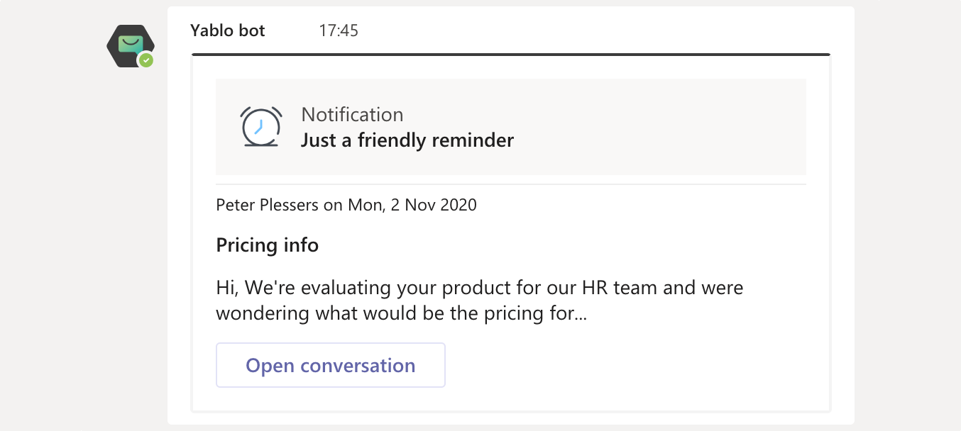 Get real-time updates from Yablo right in Microsoft Teams, so you never miss what’s important. Jump straight from the notification into the conversation and take action instantly — no delays, no confusion.