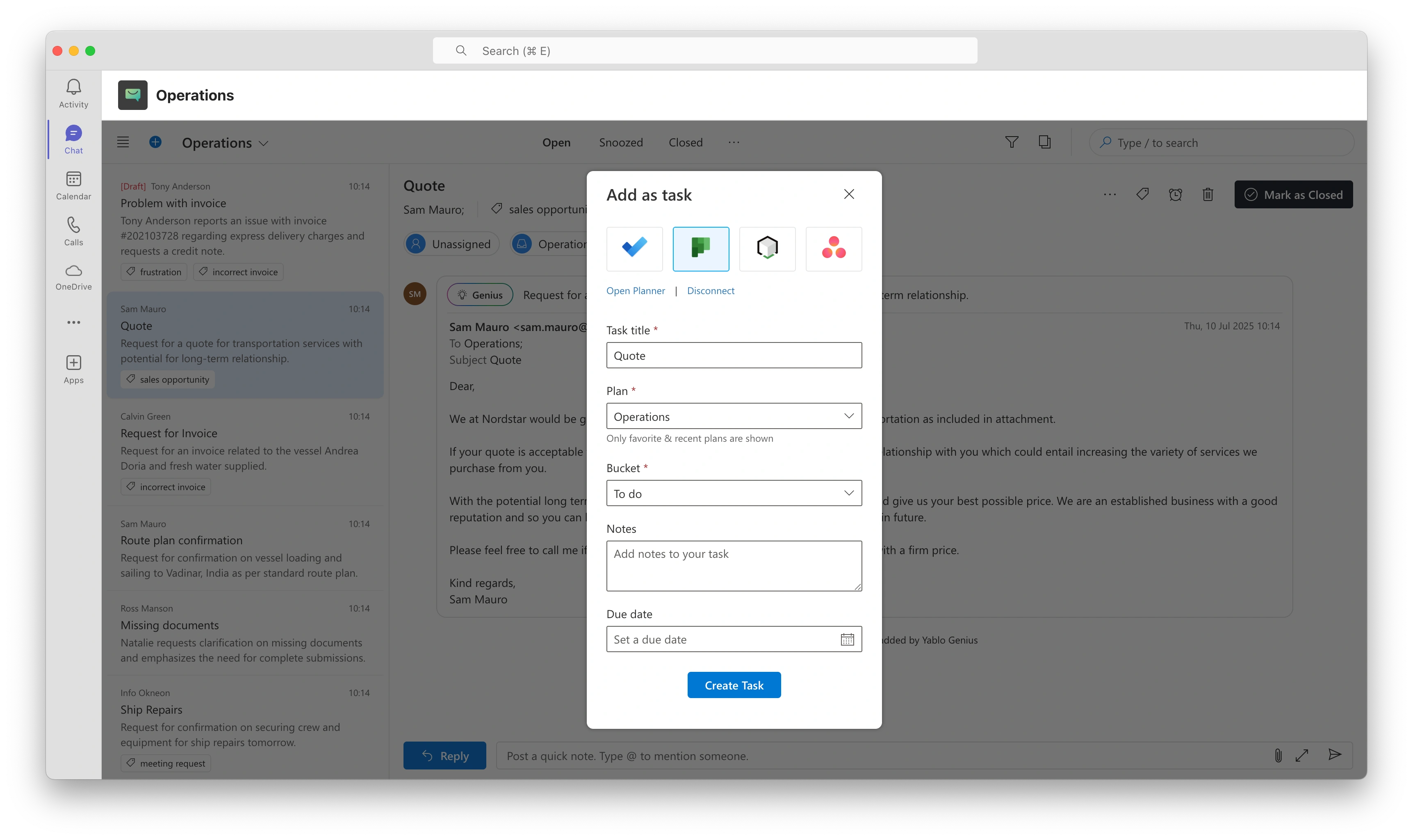 Quickly create tasks from Yablo conversations in Microsoft To Do or Planner — with a direct link back to the conversation, so you never lose context.