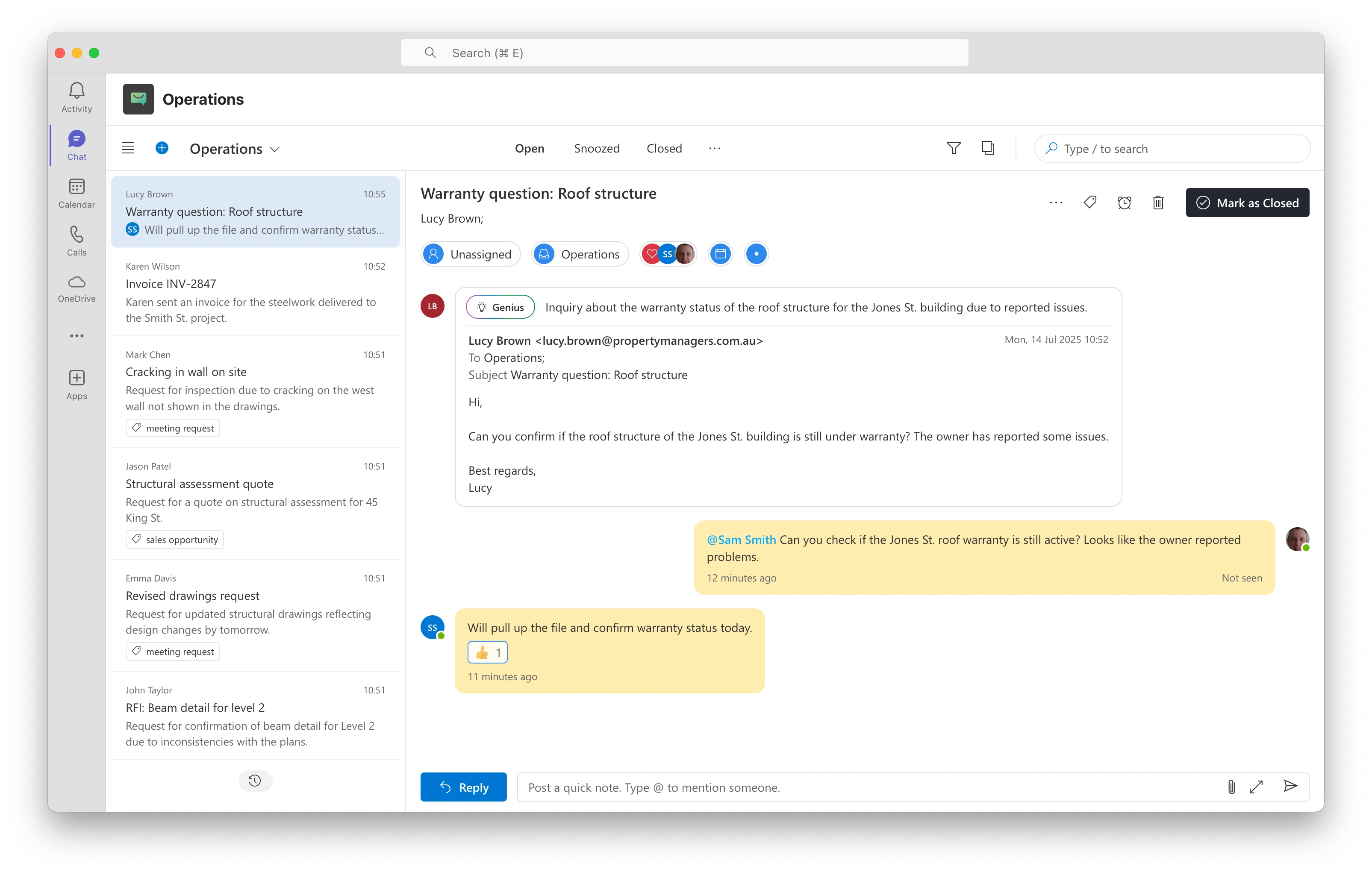 Keep communication around proposals, estimates, and change orders organized and assigned to the right estimator or engineer.